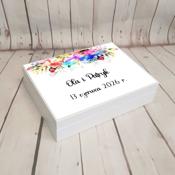 Drewniane pudelko na obraczki z kolorowym motywem kwiatów i imionami Pary Młodej z datą ślubu na wieczku to subtelny dodatek ślubny, który pozostanie pamiątką na lata. W środku do wyboru komplet poduszek lub komplet z serduszkami.