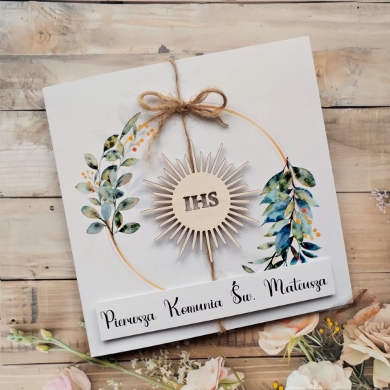 Przepiękne zaproszenia na komunie z symbolem IHS oraz z wiankiem z zielonych liści to piękny wzór, który będzie pasował zarówno dla chłopca jak i dla dziewczynki. Koperta oraz pełna personalizacja są w cenie.