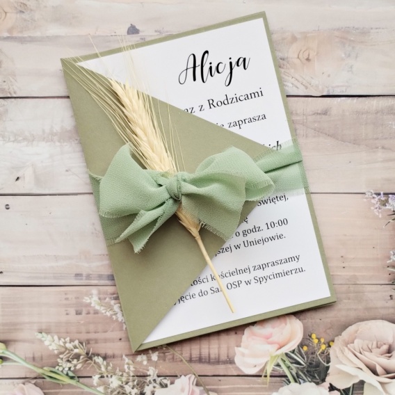 Oryginalne zaproszenia na komunie z kłosem i materiałową wstążką w modnym odcieniu zieleni to wyjątkowy wzór, który na pewno wzbudzi zachwyt w zapraszanych gościach. Koperta oraz pełna personalizacja są w cenie.