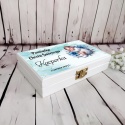 Drewniane pudełko na pieniądze w kolorystyce biało niebieskiej z motywem śpiącego dziecka i napisem „Pamiątka Chrztu Świętego” z imieniem dziecka i datą chrztu to idealne pamiatki do chrztu dla chłopca. Możliwość dedykacji wewnątrz pudełka nada indywidualnego charakteru.