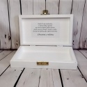 - Pudełko wykonane jest z drewna, bezpośrednio w naszej pracowni zostało pomalowane białą farbą i polakierowane kilkukrotnie akrylowym lakierem dla dodania lekkiego połysku oraz zabezpieczenia przed kurzem i brudem. Wnętrze pudełka również jest pomalowane na biało, w przeciwieństwie do wielu innych pudełek dostępnych na konkurencyjnym rynku