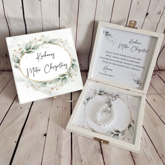 Drewniane, białe pudełko z personalizowaną dedykacją wewnątrz oraz zawieszką z perełek z aniołkiem będzie idealnym pomysłem na prezent dla chrzestnych na chrzest.