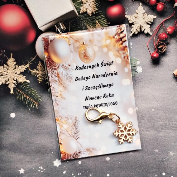 Breloczek śnieżynka z akcentem złota w komplecie z bilecikiem to idealny pomysł na drobne upominki świąteczne dla rodziny, kolegów czy klientów. Dowolna treść na bileciku, całość zapakowana w przezroczystą folijkę.