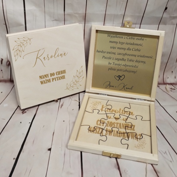 Drewniane pudełko jako prosba o swiadkowanie w formie drewnianych puzzli to oryginalny pomysł na zadanie tego ważnego pytania: czy zostaniesz moją świadkową / moim świadkiem.