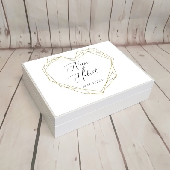 Pudelko na obrączki slubne z motywem geometrycznego serca i imionami Pary Młodej z datą ślubu na wieczku to subtelny dodatek ślubny, który pozostanie pamiątką na lata. W środku do wyboru komplet poduszek lub komplet z serduszkami.