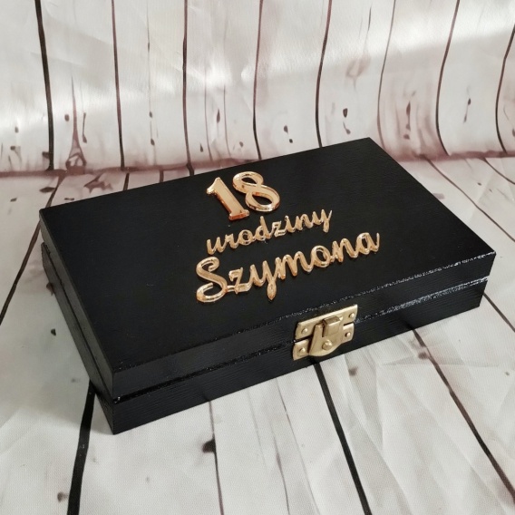 Drewniane czarne pudełko na pieniądze z okazji 18 urodzin, z personalizowanym złotym napisem na wieczku to eleganckie opakowanie na banknoty i doskonały prezent dla chłopaka na 18 urodziny.