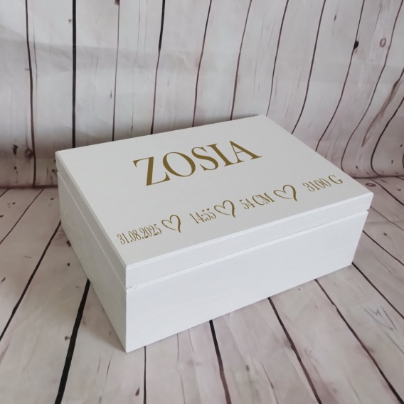 Pamiątkowe drobiazgi z pierwszych lat życia dziecka to szczególne akcesoria, które przechowywane są z szczególną dbałością. Drewniane białe pudełko wspomnień dziecka z wygrawerowanym imieniem oraz metryczką to ciekawy prezent na chrzest lub na narodziny dziecka. Na pewno przyda się każdym rodzicom, a dla dziecka pozostanie przepiękną pamiątką na lata. Do kompletu można zamówić też akcesoria do przechowywania: jest kilka białych woreczków z organzy , trzy z nich podpisane : „na pierwszy smoczek”, „na pierwszą czapeczkę” i „na pierwsze zdjęcie”. Są też cztery drewniane okrągłe pudełeczka „na pierwszy ząbek”, „na pierwszy kosmyk włosów”, „na opaskę szpitalną” oraz „na pępuszek”. Takie przechowywanie przypomni rodzicom, co warto zachować na pamiątkę dla dziecka i pozwoli stworzyć niezwykły podarunek dla dziecka. W środku można umieścić indywidualną dedykację z życzeniami i podpisem od kogo . To zarówno kreatywny prezent na chrzciny, jak i personalizowany prezent na narodziny dziecka.