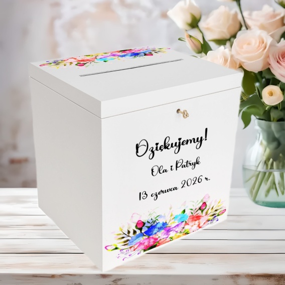 Pudełko na ślubne koperty to niezbędny element, który będzie przydatny podczas wesela, a później pozostanie piękną pamiątką. Na pudełku naniesiony motyw kwiatowy w różnych kolorach oraz napis Dziękujemy i imiona Pary Młodej z datą ślubu.
