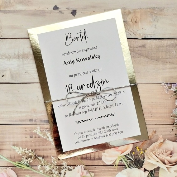 Minimalistyczne zaproszenia na 18 ste urodziny również mogą prezentować się niezwykle elegancko. Jednokartkowy wzór z jedną warstwą wykonaną ze srebrnego lustrzanego papieru świetnie prezentuje się w rzeczywistości. Dodatkowo zaproszenie przewiązane jest srebrnym metalizowanym sznurkiem. Cała personalizacja jest w cenie, a projekt dostosowujemy do Twoich oczekiwań. W komplecie jest także biała, sztywna, koperta, dostosowana do formatu zaproszenia, ale możesz też zamówić kopertę transparentną lub kolorową perłową lub matową. To wyjątkowe wzory zaproszeń na 18 urodziny, które połączy minimalizm i elegancję.