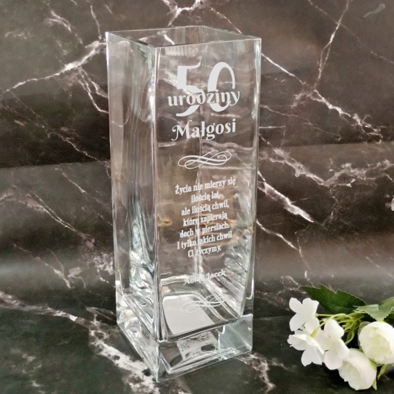 Wyjatkowy prezent na urodziny to taki podarunek, który pozostanie pamiątką na lata. Podaruj kobiecie przepiękny, szklany wazon na kwiaty z grawerowanym, personalizowanym tekstem z cyfrą urodzin, imieniem, krótką dedykacją „Życia nie mierzy się ilością lat, ale liczbą chwil, które zapierają dech w piersiach. i Tylko takich chwil Ci życzymy” oraz podpisem od kogo. Wazon jest bardzo solidny, wykonany z grubego szkła. Dzięki indywidualnej dedykacji będzie doskonałym pomysłem na prezent dla niej urodziny. Doskonale podkreśli piękno bukietów kwiatowych oraz innych kompozycji kwiatowych i będzie dekoracją każdego stołu. To na pewno najlepszy prezent na dla kobiety na urodziny, która kocha klasykę i elegancję.