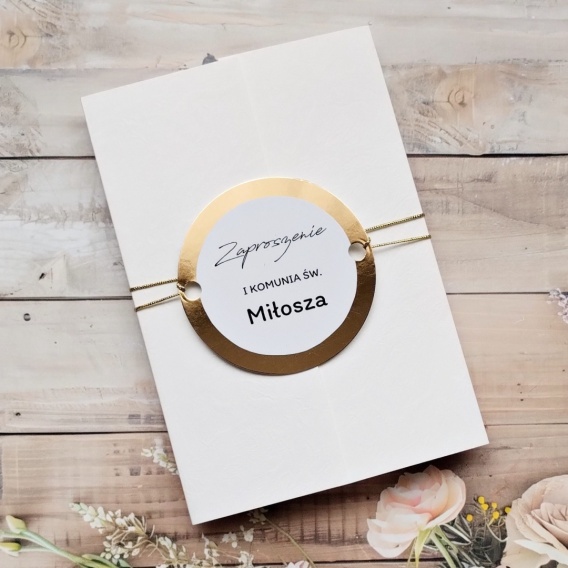 Oryginalne zaproszenia komunia swieta to takie które będzie wyróżniać się na tle standardowych zaproszeń. Taki jest nasz autorski wzór: bazą jest przepiękny biały papier w fakturę skóry, a jedyną, a zarazem bardzo elegancką ozdobą jest złoty sznurek i złoto-białe koło z napisem. Połączenie bieli i złota daje efekt delikatności i prezentuje się elegancko. Cała personalizacja jest w cenie, a projekt wnętrza dostosowujemy do Twoich oczekiwań. W komplecie jest także biała, sztywna koperta, dostosowana do formatu zaproszeń. Wzór zaproszeń na komunię z personalizacją to doskonały wybór, który pozwoli Ci oszczędzić czasu na ręcznym wypisywaniu wszystkich danych i nazwisk gości.