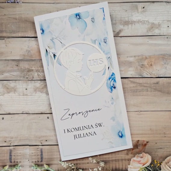 Dodanie delikatnego koloru do zaproszenia na komunię dla chłopca ożywi nieco wzór, a nadal będzie wyglądać elegancko i subtelnie. Oferowany przez nas wzór, stworzony w naszej pracowni to oryginalne zaproszenia komunijne, którego nie spotkacie nigdzie indziej. Połączenie delikatnych niebieskich kwiatów z bielą wygląda niezwykle subtelnie i elegancko. Dzięki temu połączeniu kolorów idealnie sprawdzi się jako zaproszenia komunijne dla chłopca. Dodatkowo podkreśli to też postać modlącego się chłopca z symbolem IHS,. Cała personalizacja jest w cenie, a projekt wnętrza dostosowujemy do Twoich oczekiwań. W komplecie jest także biała, sztywna koperta, dostosowana do formatu zaproszeń. Zaproszenie komunijne personalizowane to doskonały wybór, który pozwoli Ci oszczędzić czasu na ręcznym wypisywaniu wszystkich danych i nazwisk gości.