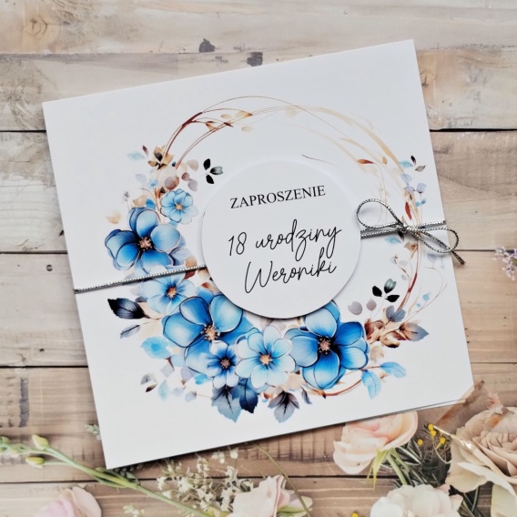 Jeśli szukasz zaproszenia osiemnastka w żywych kolorach, postaw na ten wzór z motywem wianka z kwiatów w przepięknym odcieniu niebieskiego. Cała personalizacja oraz koperta są w cenie.